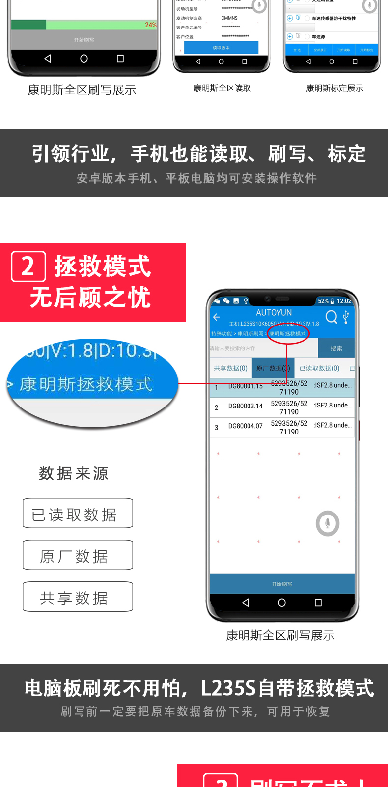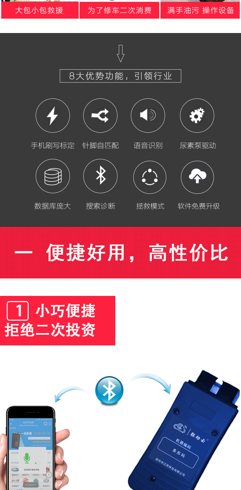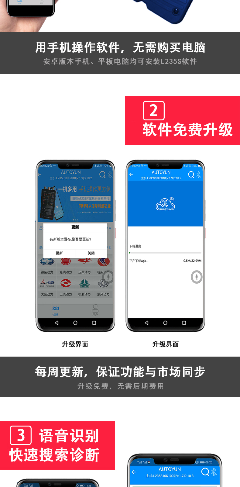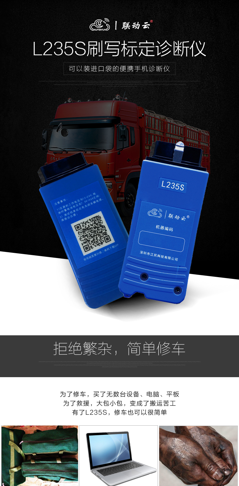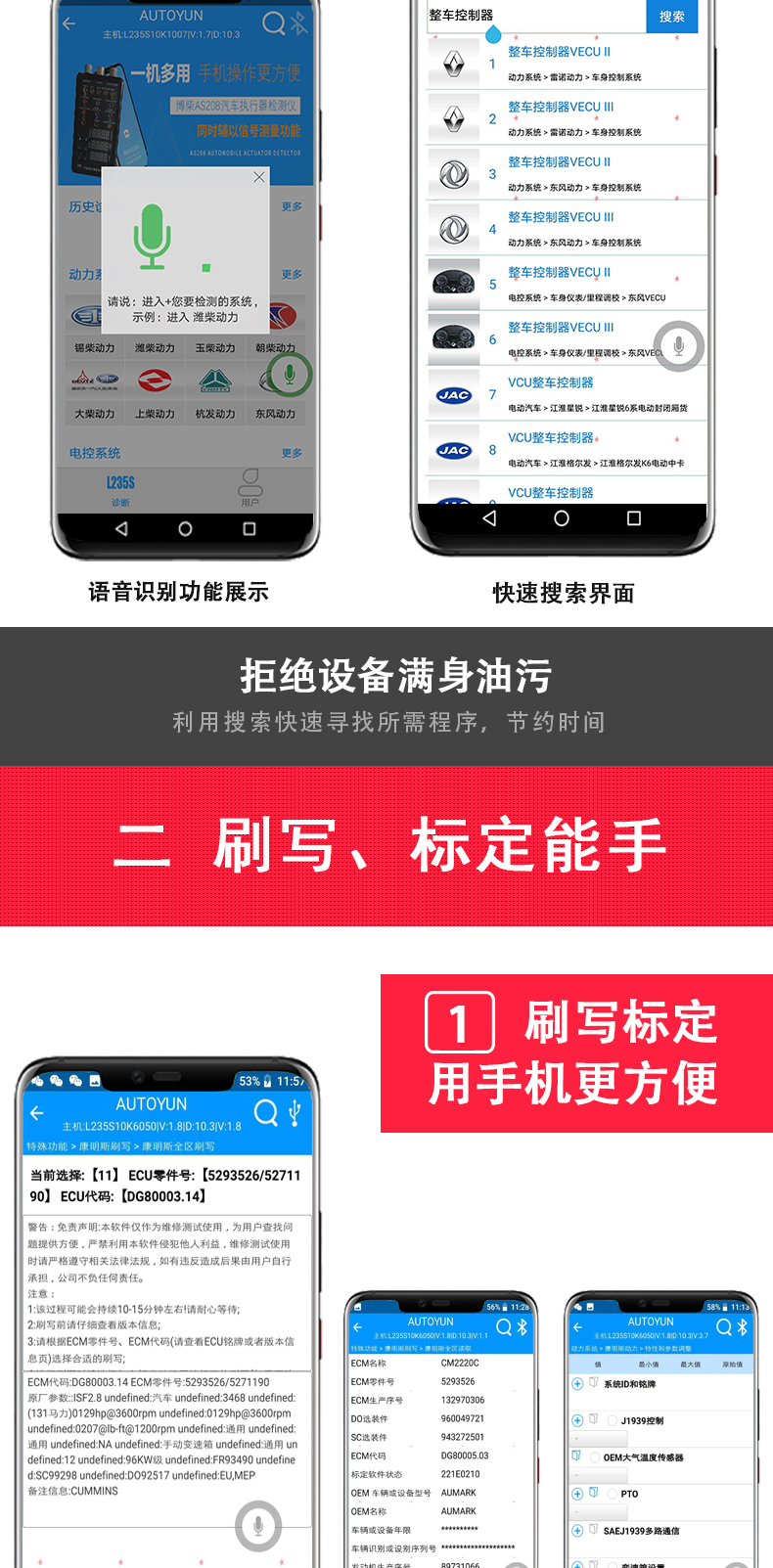 聯(lián)動云L235S智能語音版手機(jī)診斷儀開創(chuàng)商用車診斷便捷化,一個插頭足可以診斷幾乎市面上包含工程車輛,卡客車,大中小柴油系列發(fā)動機(jī),修車隨時隨地?zé)o懼刮風(fēng)下雨,無懼天冷手凍,無懼電腦沒電,一個診斷設(shè)備可以同時安裝五部手機(jī)使用,具備故障診斷,標(biāo)定刷寫,是維修技師外出應(yīng)急救援必備神器,同時也是維修門店必備的第二臺診斷設(shè)備,解放雙手語音喚醒進(jìn)系統(tǒng),簡單快捷,方便高效。